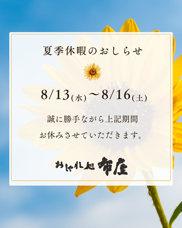 休暇中にいただきましたお問い合わせにつきましては、夏季休暇期間後に返信させていただきます。