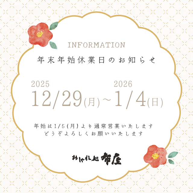 年末年始休業日のお知らせ 2025年12月27日 最終更新日時 : 2025年12月27日 nunoya029 誠に勝手ながら、12月29日(月)から1月4日(日)まで年末年始休暇とさせていただきます。1月5日(日)から通常営業いたします。