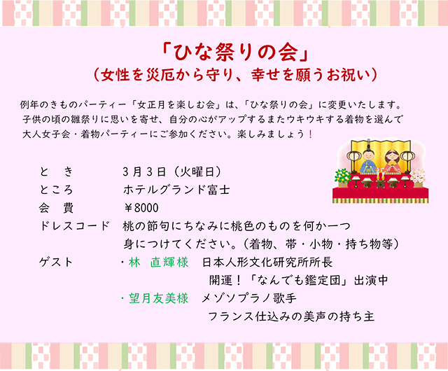その想いから続いてきた『女正月を楽しむ会♪』は、今年より装いも新たに『ひなまつりの会♪』として生まれ変わります。